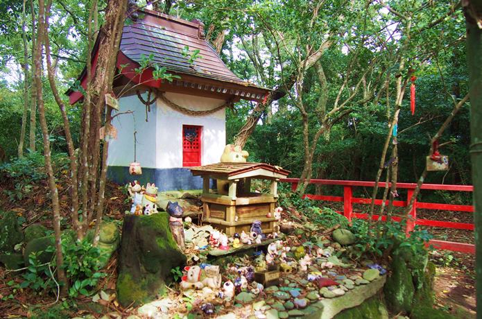 木々に囲まれた神社では、その周りに猫のグッズや置物がお供えされています。