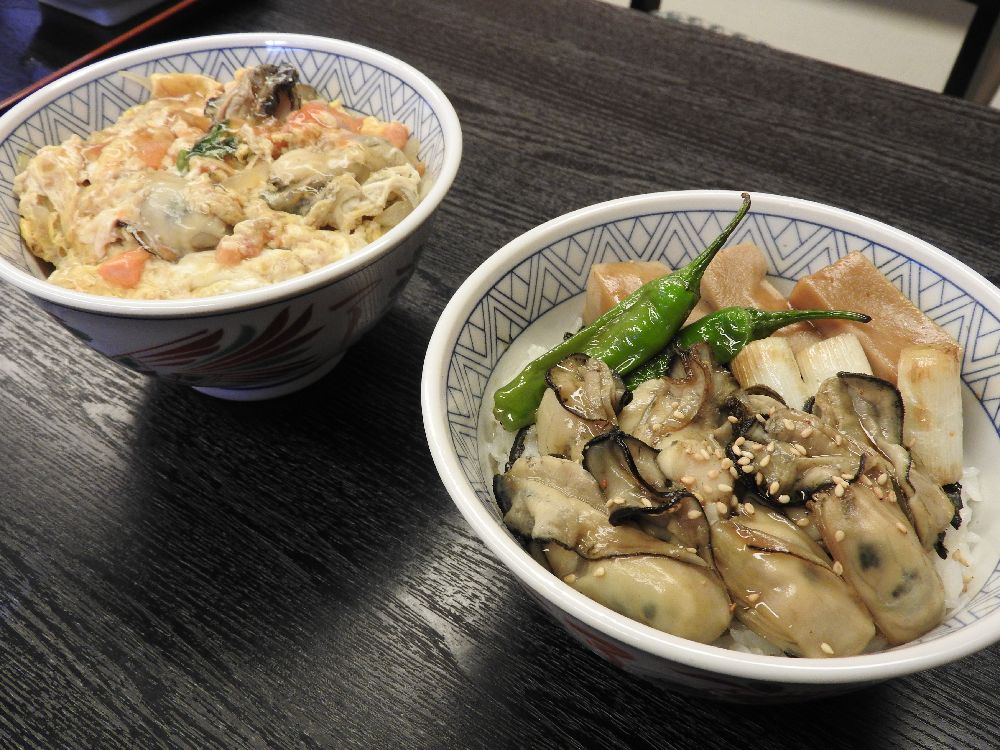 左が「復活丼(牡蠣トマト丼)」、右は大もりやオリジナルの「牡蠣丼」