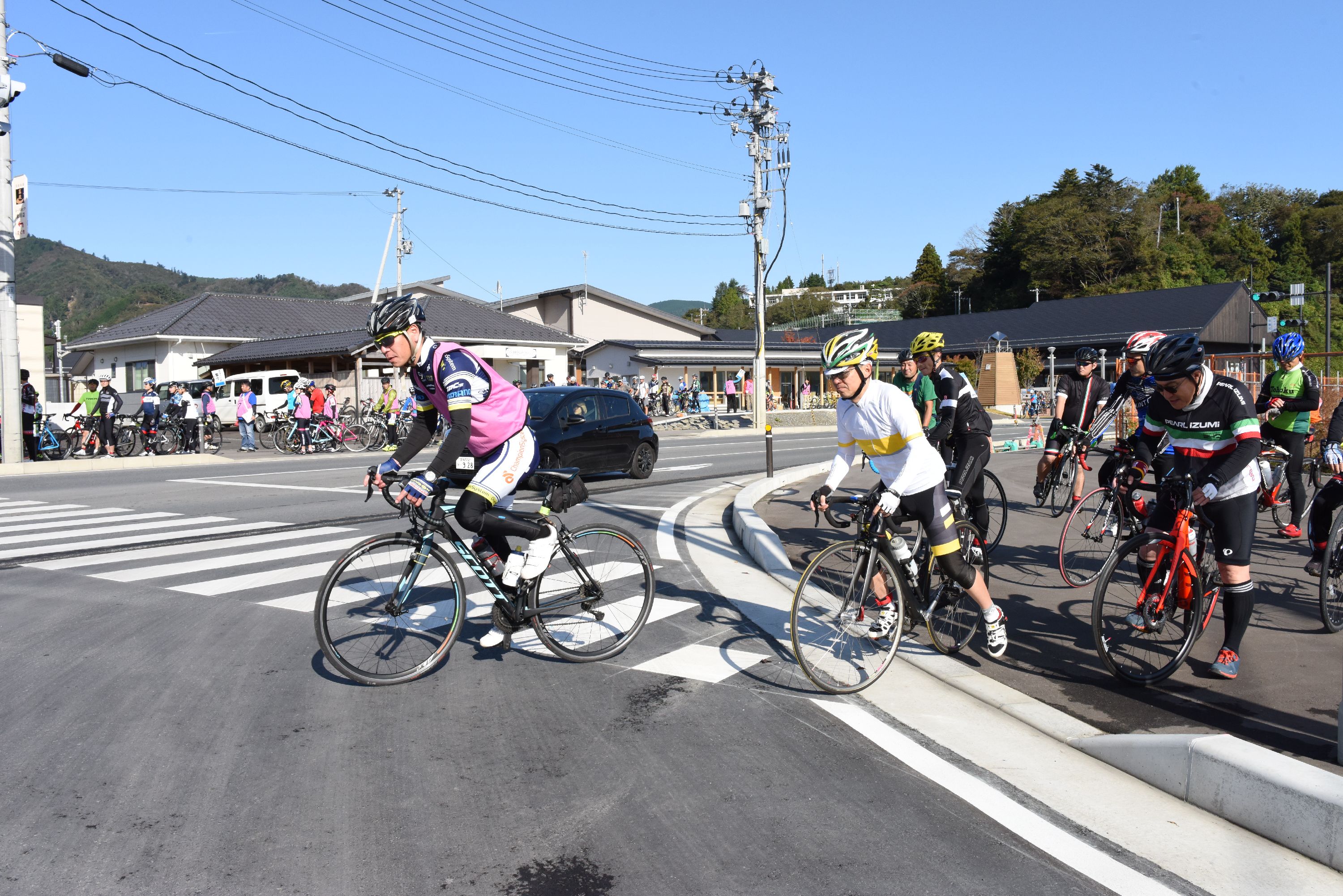 【走行管理ライダーの先導でヒルクライムスタート地点へ移動】
