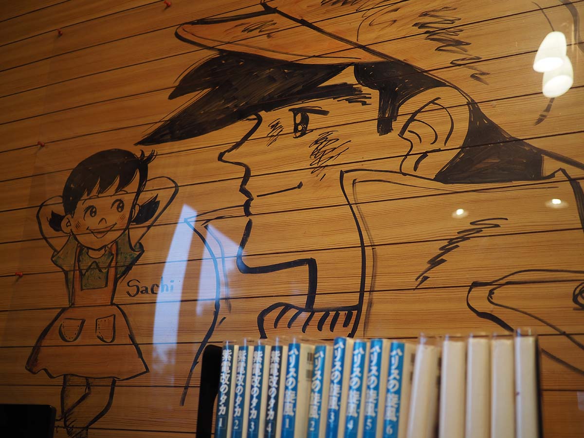 しろロッジは漫画家のちばてつや先生がデザインをされたそうで、室内の壁には至る所にちば先生の絵が描いてあります。「かけてある」のではなく、直接壁に「書いてある」ので、この絵はロッジに泊まった人しか見られません。
