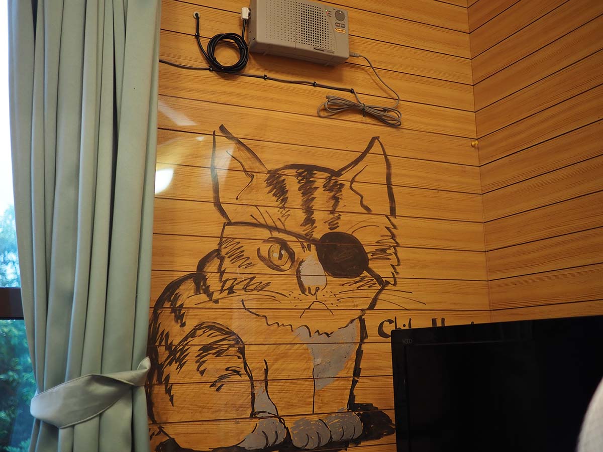 しろロッジは漫画家のちばてつや先生がデザインをされたそうで、室内の壁には至る所にちば先生の絵が描いてあります。「かけてある」のではなく、直接壁に「書いてある」ので、この絵はロッジに泊まった人しか見られません。