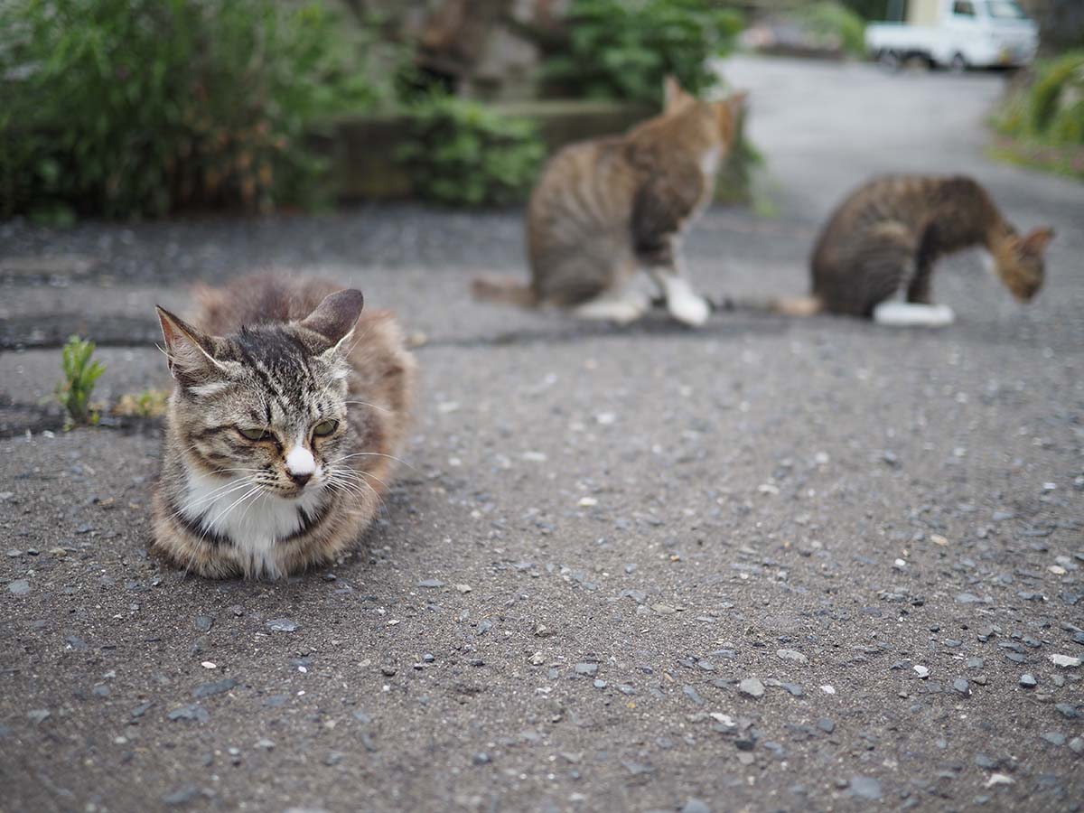 ロッジから猫神社に向かう道中、家があるところには猫が集まっています。島民の方が食べ物を分けてくれるので家の周りに集まっているのでしょう。ばっと見た範囲に10匹近くも無警戒な猫が集まっているのは感動ものです。