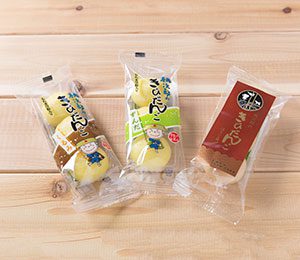 石巻市桃生町のお土産として人気。3個で1袋と手軽に持ち運べるもっちり食感のきびだんごは、くるみ餡、ずんだ餡、ほうじ茶の3種類。保存料を使わず、天然着色料のみ使用。