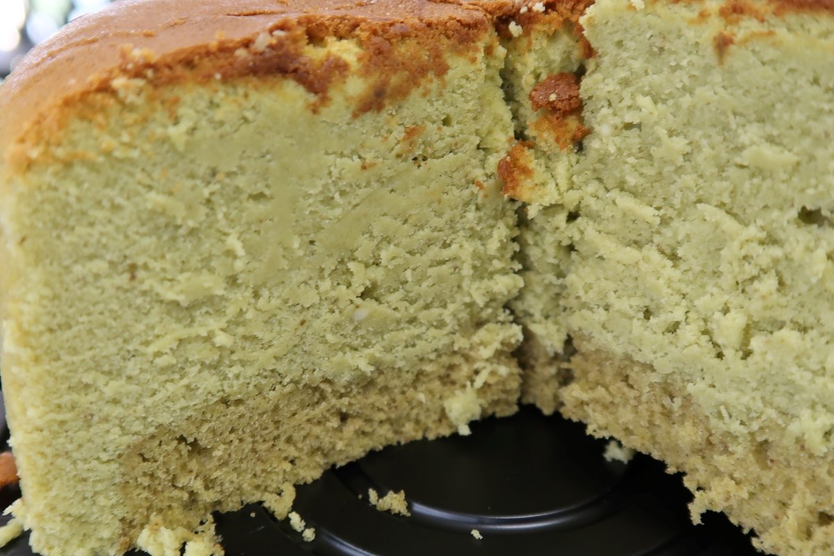 ふわっと香るこうばしいかおりに緑がっかたチーズケーキです。オリーブの葉を生地に練りこんんで作られています。