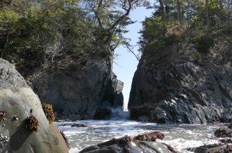 神割崎は、その昔争う人々を鎮めるため神の裁きによって岩が割かれたという伝説が残る景勝地。波打ち際まで近づけるため迫力満点の波を見られる。